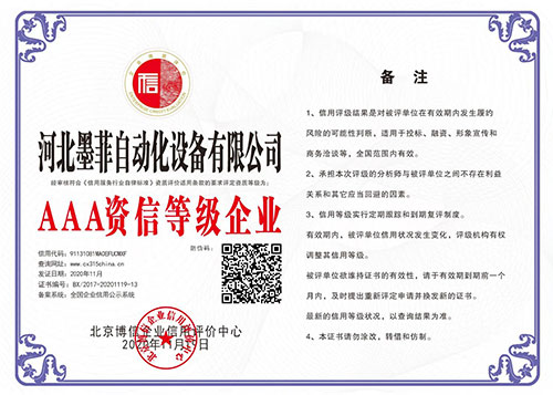2021年企业不断完善,引进技术人才、配套技术、新信息引进,提升企业技术实力,并将工艺创新 放在首位,致力为客户提供更先进、更符合生产需求的专机设备。企业建立完善的售后服务,诚信为客户服务,并得到认可获得AAA级信用企业。目前客户已遍及全国各地,并以良好的信誉、完善的服务、过硬的品质、亲民的价格而受到广大客户的信赖和支持。